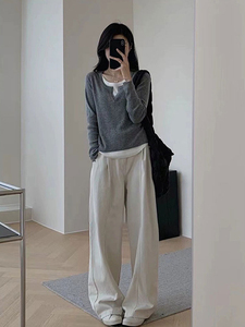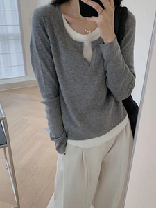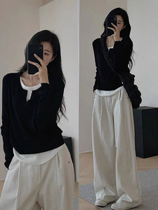 早秋chic上衣黑色假两件v领长袖t恤女2025新款内搭修身显瘦打底衫