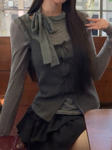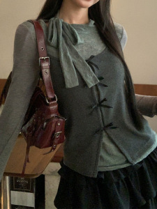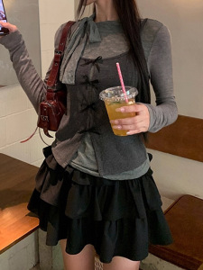 槿一 长袖打底衫女2025新款早秋灰色t恤修身巨好看的上衣两件套潮