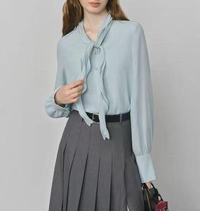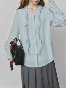 范思蓝恩 荷叶边蓝色飘带衬衫女2025秋装新款韩系通勤V领衬衣