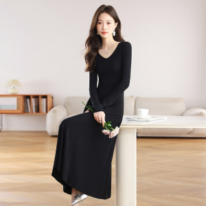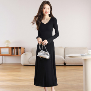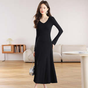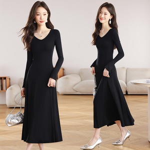 长袖V字领赫本风黑色针织连衣裙女2025秋季高级感内搭显瘦长裙子