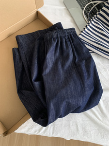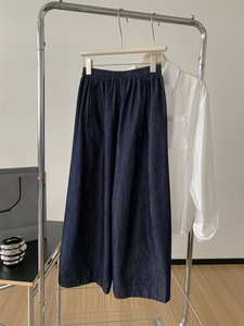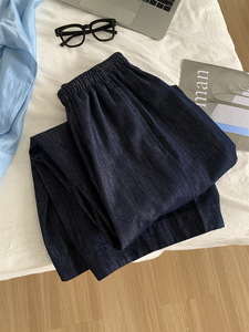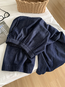 2025夏款垂感显瘦拼接阔腿九分奶奶裤小个子薄深蓝色牛仔气球裤女