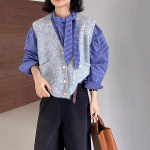 春秋季新款灰色针织马甲女洋气独特别致格子衬衫叠穿马甲两件套女