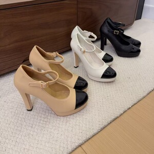 高版25秋冬小香拼色防水台粗跟超高跟真皮底一字搭扣玛丽珍单鞋女