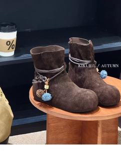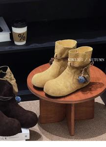 大头平底内增高短筒靴子女2025秋冬新款磨砂皮休闲毛绒挂饰时装靴