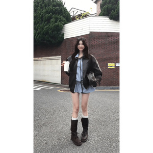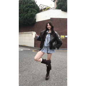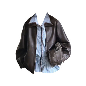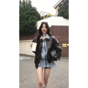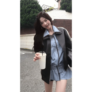 早秋新款高级感夹克皮衣外套收腰显瘦条纹连衣裙两件套