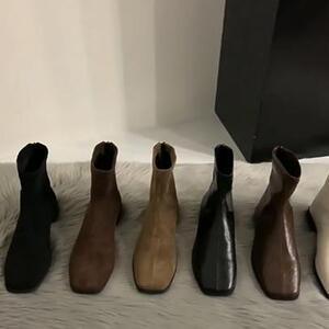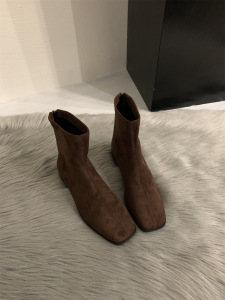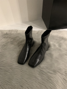 2025秋冬季新款极简软皮方头百搭低跟马丁靴女后拉链平底瘦瘦短靴