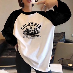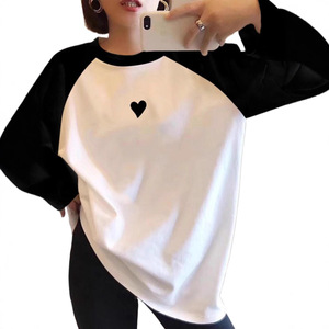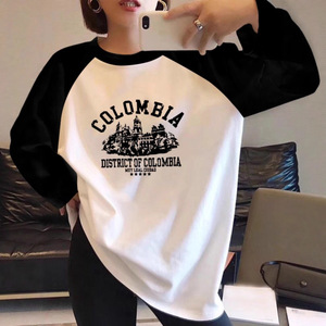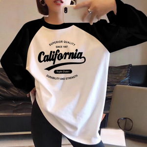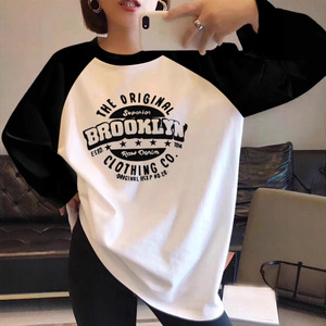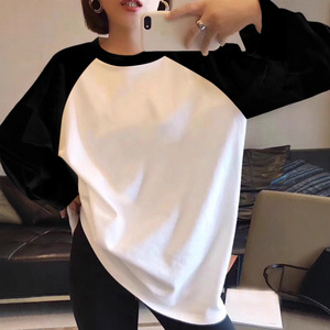 黑白撞色秋冬季插肩袖2025年长袖T恤女内搭打底衫宽松棉质上衣