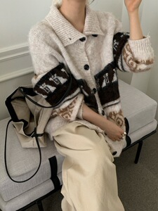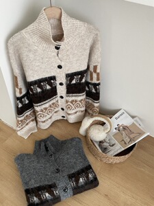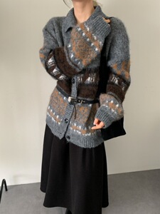 秋冬新款提花针织休闲开衫女宽松高领毛衣外套复古撞色长袖上衣
