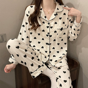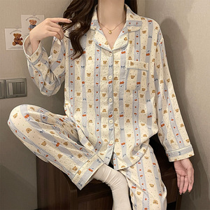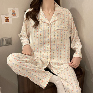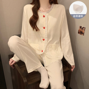 带胸垫棉质长袖花边开衫睡衣女春秋季新款简约休闲家居服两件套装