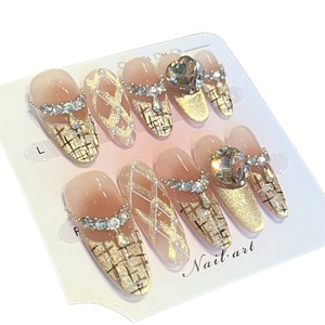 法式香颂纯手工穿戴甲菱形格红棕晕染秋冬高级气质穿戴甲成品批发