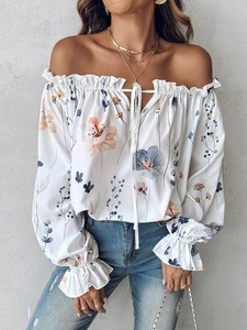2025欧美跨境春秋新款一字肩印花长袖上衣 休闲花朵印花长袖