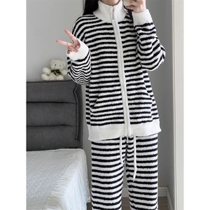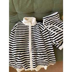 现货韩版小众条纹连帽针织半边绒睡衣女秋冬季睡袍女冬加厚加绒