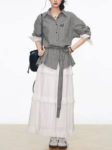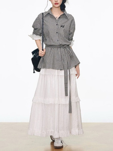 8.12新品 WESTAYON 黑色格拼接花边衬衫+白色镂空蛋糕长裙 两件套