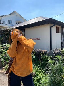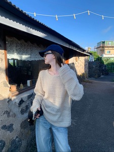 闲暇周末~马海毛镂空提花圆领针织衫女秋宽松慵懒针织罩衫