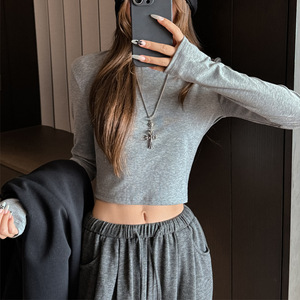 天丝莱赛尔小圆领秋冬短款修身打底衫女内搭简约正肩长袖t恤百搭
