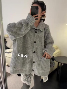 韩系复古高领毛衣开衫外套秋冬宽松慵懒风高级感中长款针织衫上衣