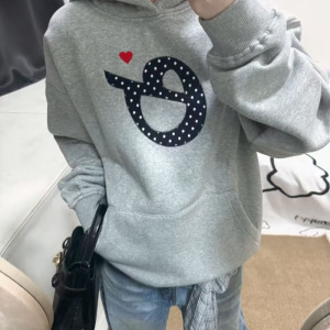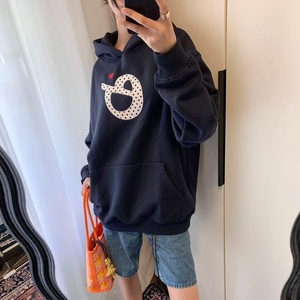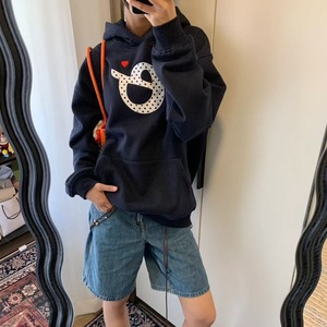 美式复古波点字母刺绣连帽卫衣女秋冬学院风宽松百搭藏青色上衣潮