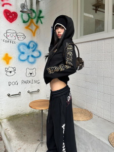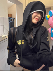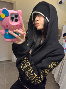 美式复古趣味图案长袖连帽卫衣女春秋设计感宽松气质休闲百搭外套