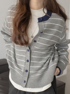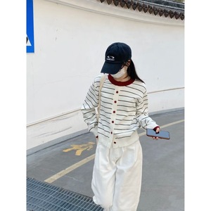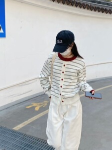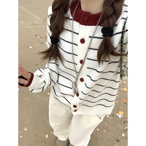 韩系学院风ins撞色条纹针织开衫女春秋季新款单排扣宽松上衣外套