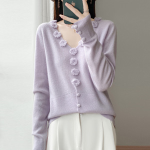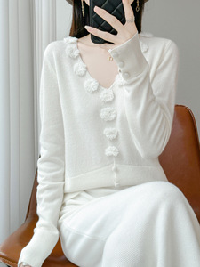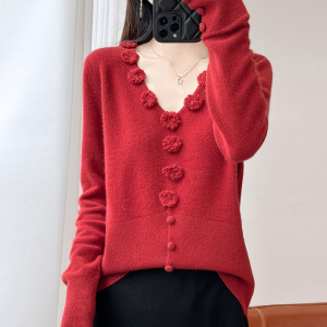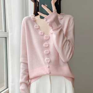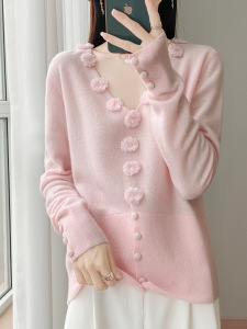 100%羊毛v领针织衫甜美减龄粉色秋季女装新款拼接钩花针织打底衫