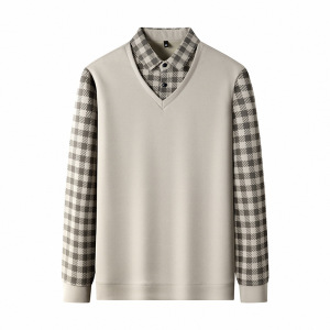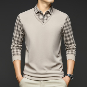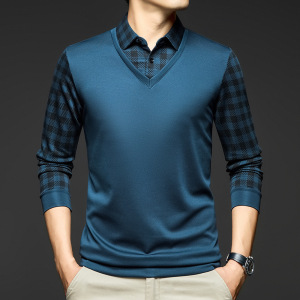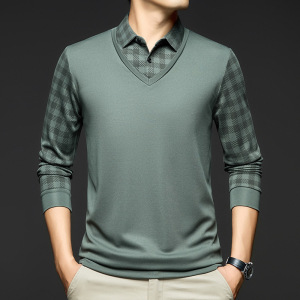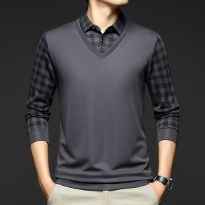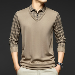2025秋季男士长袖针织T恤中年时尚韩版宽松衬衫领假两件Polo衫男