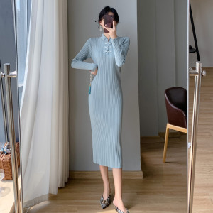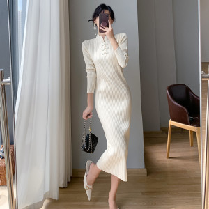 2025跨境秋冬针织毛衣连衣裙女中长款复古旗袍风盘扣修身显瘦裙