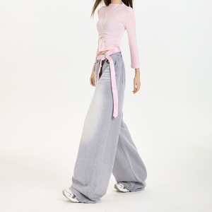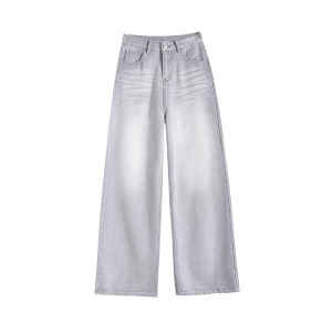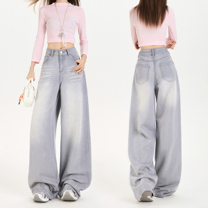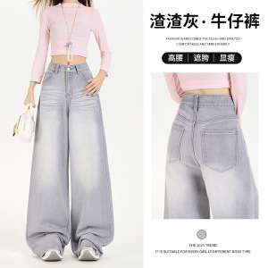 美式复古灰色阔腿牛仔裤女2025新款高腰宽松bf风显瘦百搭直筒裤子