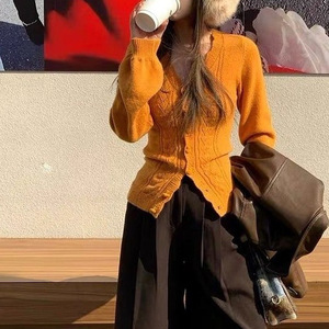 橘色镂空v领针织开衫女2025秋季新款高级感修身显瘦内搭打底上衣