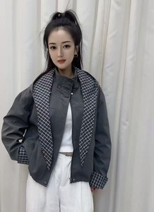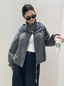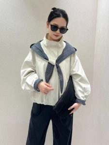 韩系时尚假两件外套女2025秋季简约撞色格纹时尚百搭休闲夹克上衣