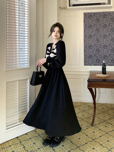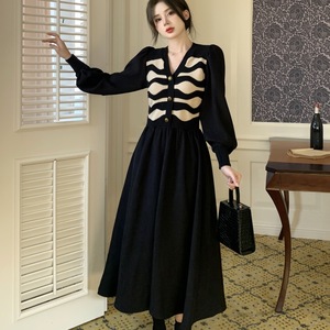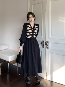 洋气假两件针织连衣裙女装春春秋气质v领过膝裙中长遮肚显瘦a字裙
