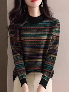 半高领复古提花毛衣女秋冬季2025新款百搭洋气条纹短款打底针织衫