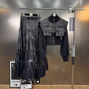 立领长袖拼接口袋假两件设计感毛衣搭配半裙套装