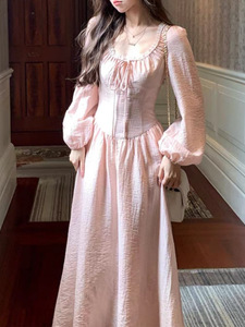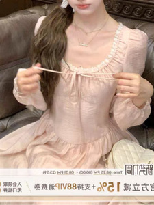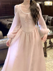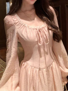 蜜桃奶冻/粉色u领长袖收腰a字连衣裙女秋法式气质显瘦裙子
