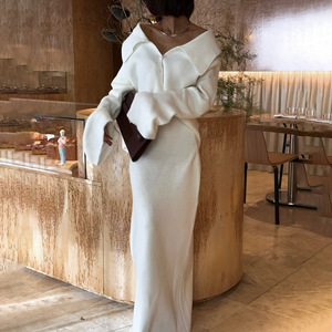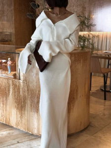 高级气质慵懒风针织两件套喇叭袖大翻领拉链衫包臀拖地长裙女简约