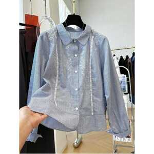 高级感翻领条纹长袖衬衫女早秋季薄款拼蕾丝法式独特精致小上衣