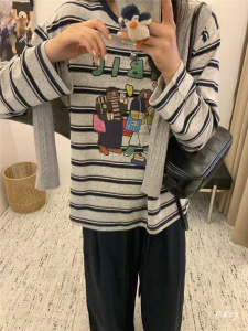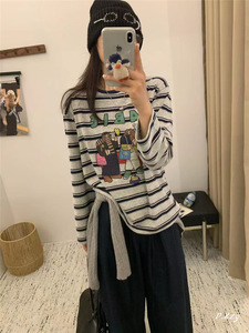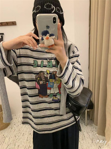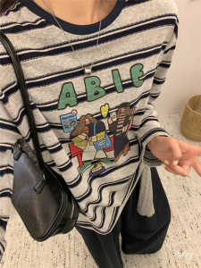 011秋季2025新款慵懒风松弛感卡通条纹上衣薄棉长袖打底衫女士T恤