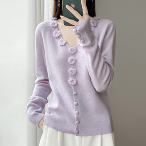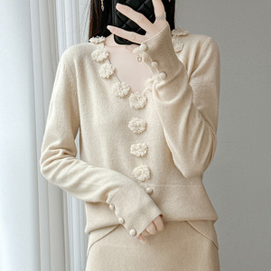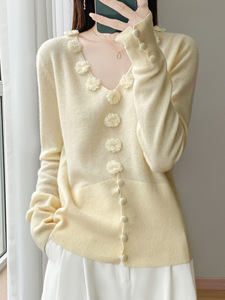 重工立体钩花羊毛衫时尚甜美V领针织打底衫新款100羊毛软糯毛衣女