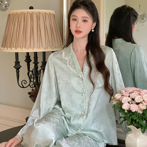 法式睡衣套装女士秋季新款色丁提花两件套装长袖长裤家居服可外穿