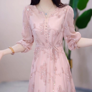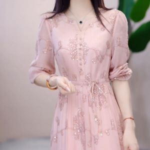 高级琉璃丝气质端庄优雅刺绣礼服裙2025春夏新款中青年修身连衣裙