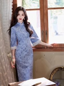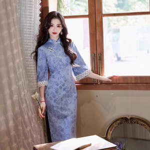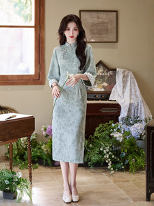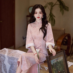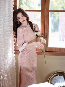 唐依恋粉色新中式倒大袖长款长袖旗袍秋季2025新款女复古修身收腰