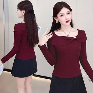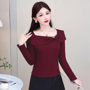 2025秋季新款设计感气质方领长袖T恤女时尚修身显瘦百搭套头上衣