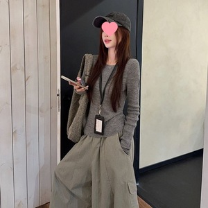 时尚韩系长袖针织衫叠穿挂脖背心女秋季显瘦百搭工装休闲裤三件套