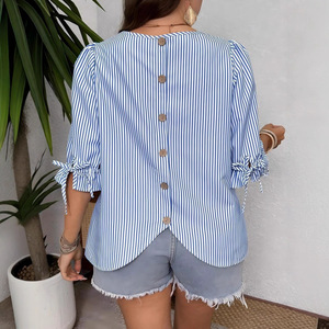 现货跨境女装2025ebay亚马逊欧美七分袖蓝色条纹纽扣设计衬衫上衣