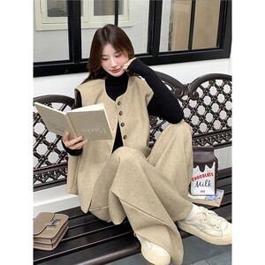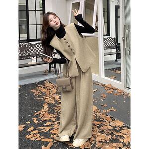 卡其色高级感马甲阔腿裤套装女秋季新款韩系小个子气质松弛两件套