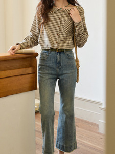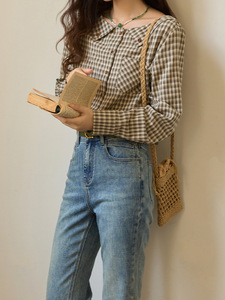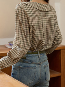 韩系格子船领衬衫女2025秋季新款女斜插袋撞色纽扣收腰衬衣上衣女