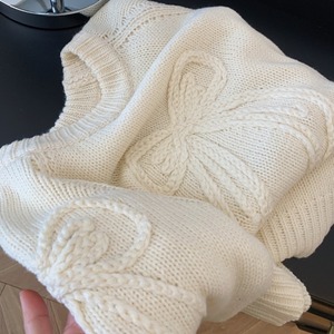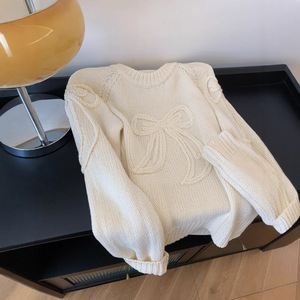 韩系甜美手工蝴蝶结短款圆领毛衣女秋冬重工粗针百搭套头针织上衣