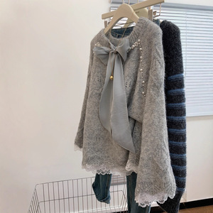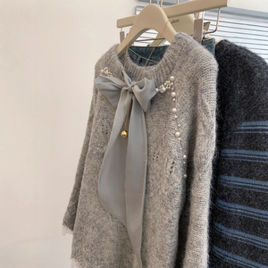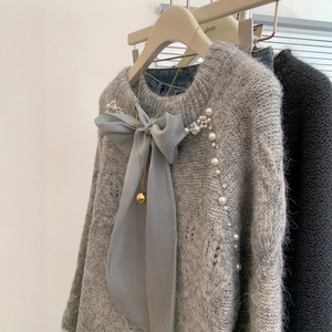 灰色蝴蝶结拼接套头毛衣女加厚中长款遮屁股洋气上衣慵懒风高级感
