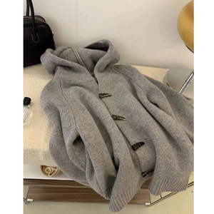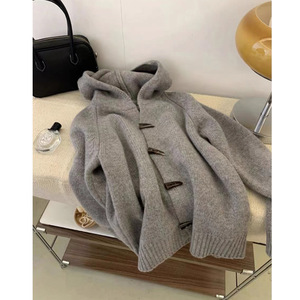 复古灰色毛衣卫衣女秋冬浣熊绒牛角扣连帽开衫外套慵懒风宽松上衣