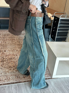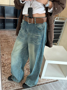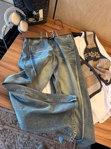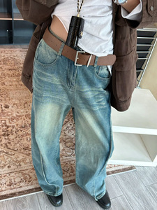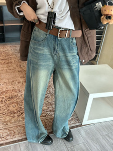 美式复古重工水洗配腰带直筒高腰阔腿牛仔裤秋冬时尚新款牛仔长裤