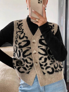 豹纹V领针织开衫慵懒风女秋冬季新款2025上衣马甲多排扣无袖